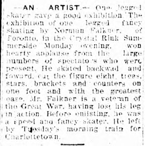 Thanks to the Skate Guard blog for filling in the blanks about Norman Falker, who entertained the good people of Summerside 100 years ago this week. He lost his leg fighting at Vimy in the First World War, survived a harrowing trip back to Canada, and went on to have a career as a professional skater and skating judge, living into his nineties.