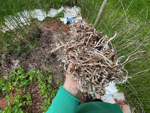 I had forgotten to bring buckets with me, so I grabbed two grocery bins from my trunk and quickly filled them with the dried grass that a high tide had helpfully deposited on some wild rose bushes, so it had been well rinsed in the rain and then dried well in the sun and wind.
