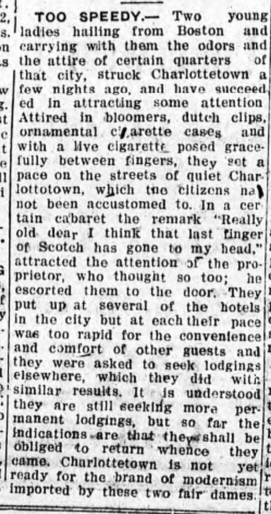 I started to read this piece from the August 3, 1922 Charlottetown Guardian thinking it would be one of many that tut-tut about young fellows racing automobiles through city streets and being a general menace, but this tale of two gals from Boston is about a different procession entirely. The tut-tutting from the city’s great and good about these two racy ladies would have been more deafening than any automobile.