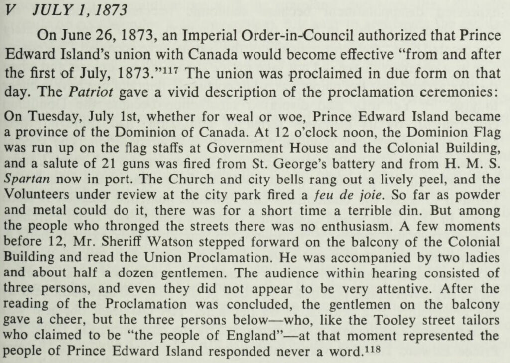 Noon today marks 150 years since Prince Edward Island joined Canada in 1873. After the overblown celebrations in 2014 to mark the 150th anniversary of the Charlottetown Conference, with the Island drenched in (coincidently?) Liberal red, I had expected something big for this year, but other than a couple of pieces on CBC Radio, this milestone hasn’t been mentioned at all. In today’s Guardian there are ads from politicians wishing everyone a happy Canada Day, but not one word about our wedding to Canada.