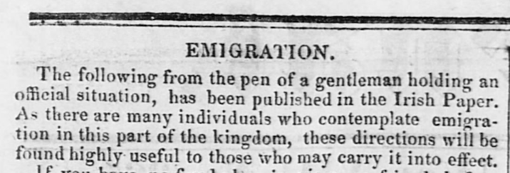 The following from the pen of a gentleman holding an official situation, has been published in the Irish Paper. As there are many individuals who contemplate emigration in this part of the kingdom, these directions will be found highly useful to those who may carry it into effect.