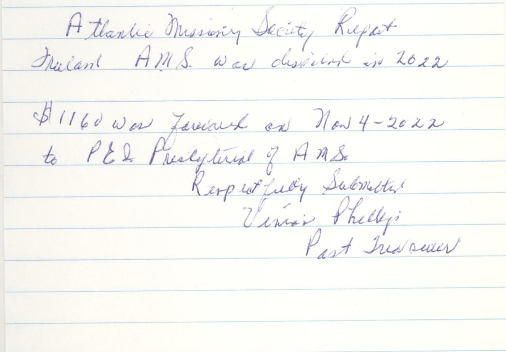 My mother has submitted her final annual financial report as treasurer of her church’s Atlantic Missionary Society group. They disbanded last year after membership dwindled to just five members all over the age of 75.