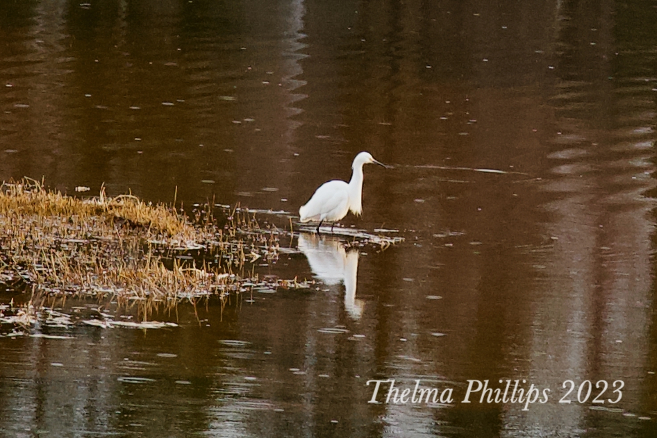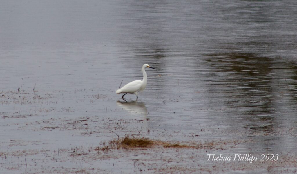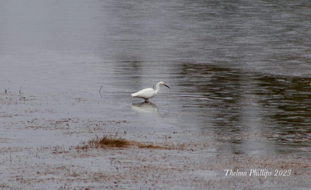First sighting. Light rain falling. The egret was walking along the short from west to east, seeming to catch many little fish.