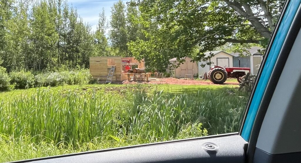 Another recent project in the area caught my eye a couple of years ago, and led to another from-the-car photo. An industrious man who lives not far from us builds small hip-roofed baby barns to sell, and nearly always has one on the go in his front yard. In 2022, I noticed a concrete pad had been poured near his vegetable garden and wondered what he was going to build. A portable saw mill arrived and was placed on the pad a few weeks later, and soon he began sawing logs into lumber.