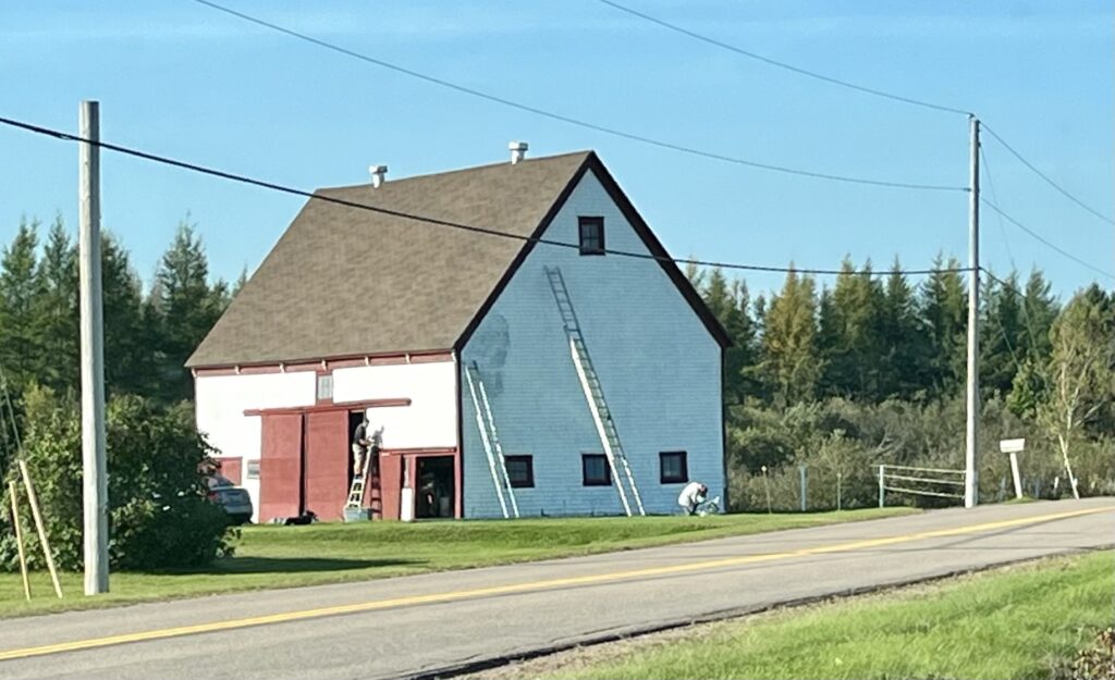 I happened upon an historic moment while driving home the other day: the painting of the Williams barn in Poplar Grove. Built around 1865, it is certainly one of the oldest barns in our area, if not the province. It was built by my great-great grandfather, Robert Williams, and is owned by his great-grandson Robert, known as Robbie. Robbie and his wife, Sandra, have taken loving care of both the original house and the barn.